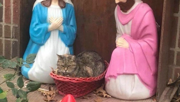 A grumpy feline decided to crash a Nativity scene in front of someone’s home.