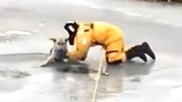 Hero Firefighter Slides Onto Thin Ice To Rescue Dog Who Fell Through
