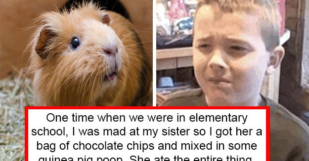 I talked my sister into climbing into the dryer and then turned it on for maybe five seconds. My vegetarian sister made me mad about something so I put pork juice in her dish of ice cream, sat back, and watched her eat every. single. bite. When she didn t feel good later, I convinced her she was lactose intolerant. —maggief46d5fe7f6 imgur.com / Via reddit.com When my sister and I were little we both loved playing The Sims. She spent a long time making a family with a husband that looked like her real-life crush. Well, she did something to piss me off one day, so I made a Sim, struck up a friendship with her Sim husband, married him, killed his wife, and adopted their dog. When she logged back in there was just a tombstone on the lot. —jenniferc4003517b6 I was 11 when my parents had my little brother. They allowed me to help me select his name. Our last name is Smith. The name I selected for my brother is "Austin Samuel." My brother s name is now Austin Samuel Smith. It too